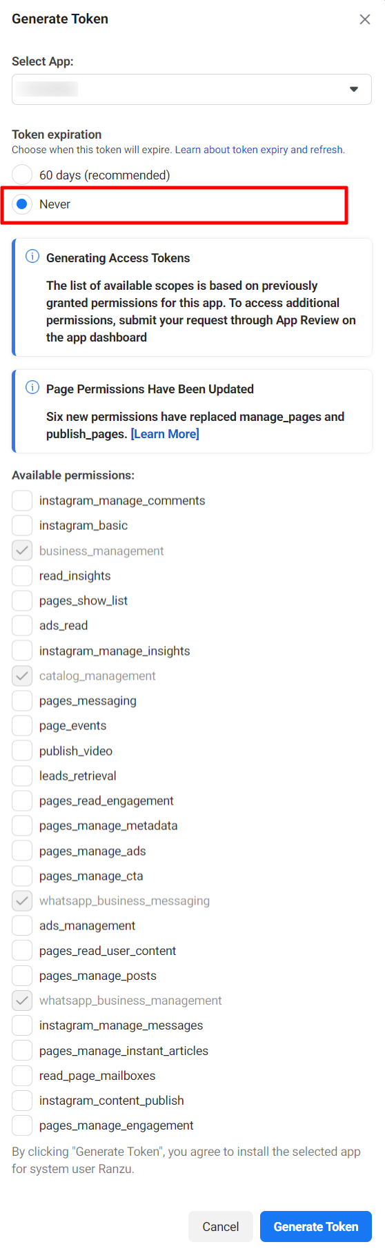 Then a list of available permission will appear. From the list, you have to select Business management,Catalog management,WhatsApp business messaging, and WhatsApp business management. Now click on the Generate token button.