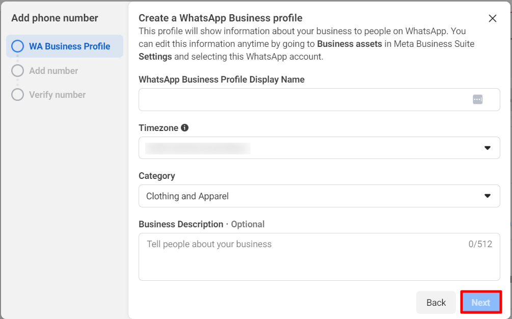 In the WhatsApp Business Profile display name, you have to provide a display name. Then in the Timezone field, select a timezone. Then select a category of your business in the Category field. Click on the Category field and a drop-down list of the different categories will appear. And from the list select a category.