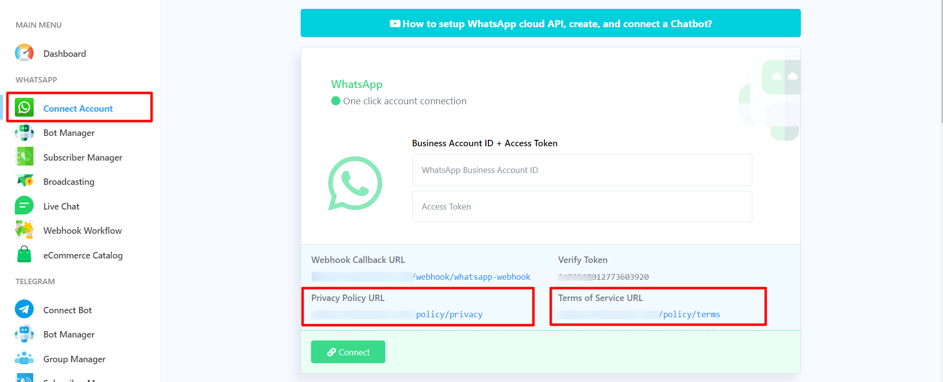 To get the callback URL and verify the token from BotSailor. Login to your account and go to the dashboard of BotSailor. At the left sidebar of the Dashboard, under the WhatsApp section, you will see connect WhatsApp option. Now click on the connect WhatsApp menu and instantly, Connect WhatsApp Business page will appear.
